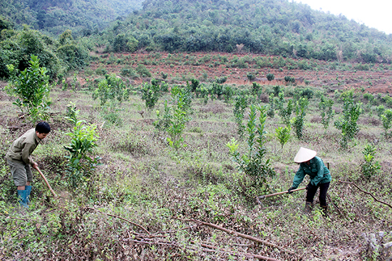 Nông dân bản Thín, xã Xuân Nha (Vân Hồ) chăm sóc vườn cây ăn quả.