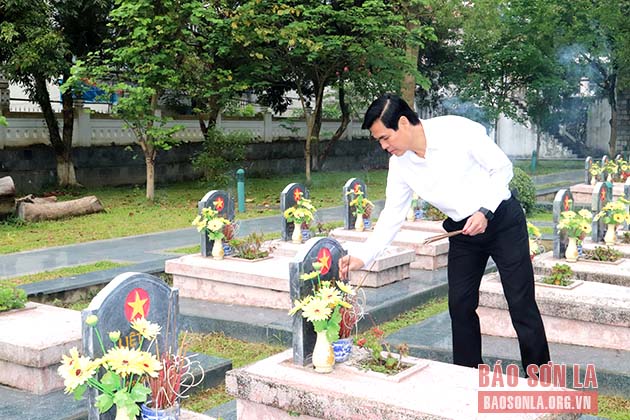Đồng chí Lò Minh Hùng, Phó Bí thư Thường trực Tỉnh ủy thắp hương tưởng nhớ các Anh hùng liệt sĩ Điện Biên tại Nghĩa trang Đồi A1.