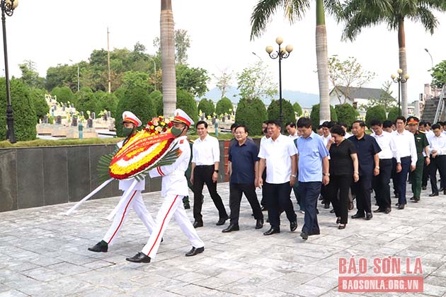 Các đồng chí lãnh đạo tỉnh Sơn La và Điện Biên dâng hương tưởng nhớ các Anh hùng liệt sĩ Điện Biên tại Nghĩa trang Tông Khao.