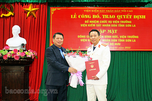 Theo đó, lãnh đạo Vụ Tổ chức cán bộ, Viện Kiểm sát nhân dân Tối cao đã công bố Quyết định số 03/QĐ-VKSTC ngày 31/12/2021 của Viện Kiểm sát nhân dân Tối cao về việc bổ nhiệm ông Phùng Mạnh Hùng, Phó Viện trưởng Viện Kiểm sát nhân dân tỉnh Sơn La giữ chức vụ Viện trưởng Viện Kiểm sát nhân dân tỉnh Sơn La, thời hạn là 5 năm kể từ ngày 1/1/2022. Đồng thời, trao Quyết định của Viện Kiểm sát nhân dân tối cao về việc nghỉ hưu hưởng chế độ bảo hiểm xã hội đối với ông Nguyễn Đình Đức, nguyên Viện trưởng Viện Kiểm sát nhân dân tỉnh Sơn La từ ngày 1/1/2022.