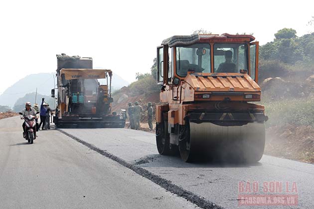 Các đơn vị đang tập trung rải thảm nhựa bê tông.