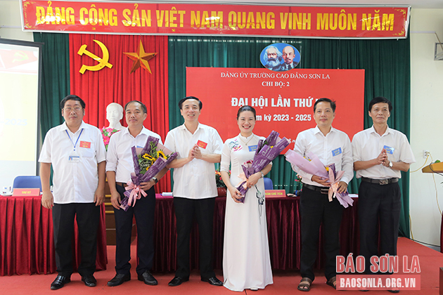 Lãnh đạo Đảng ủy Khối CCQ và DN tỉnh cùng Trường cao đẳng Sơn La tặng hoa chúc mừng Chi ủy chi bộ 2, nhiệm kỳ 2023 - 2025.