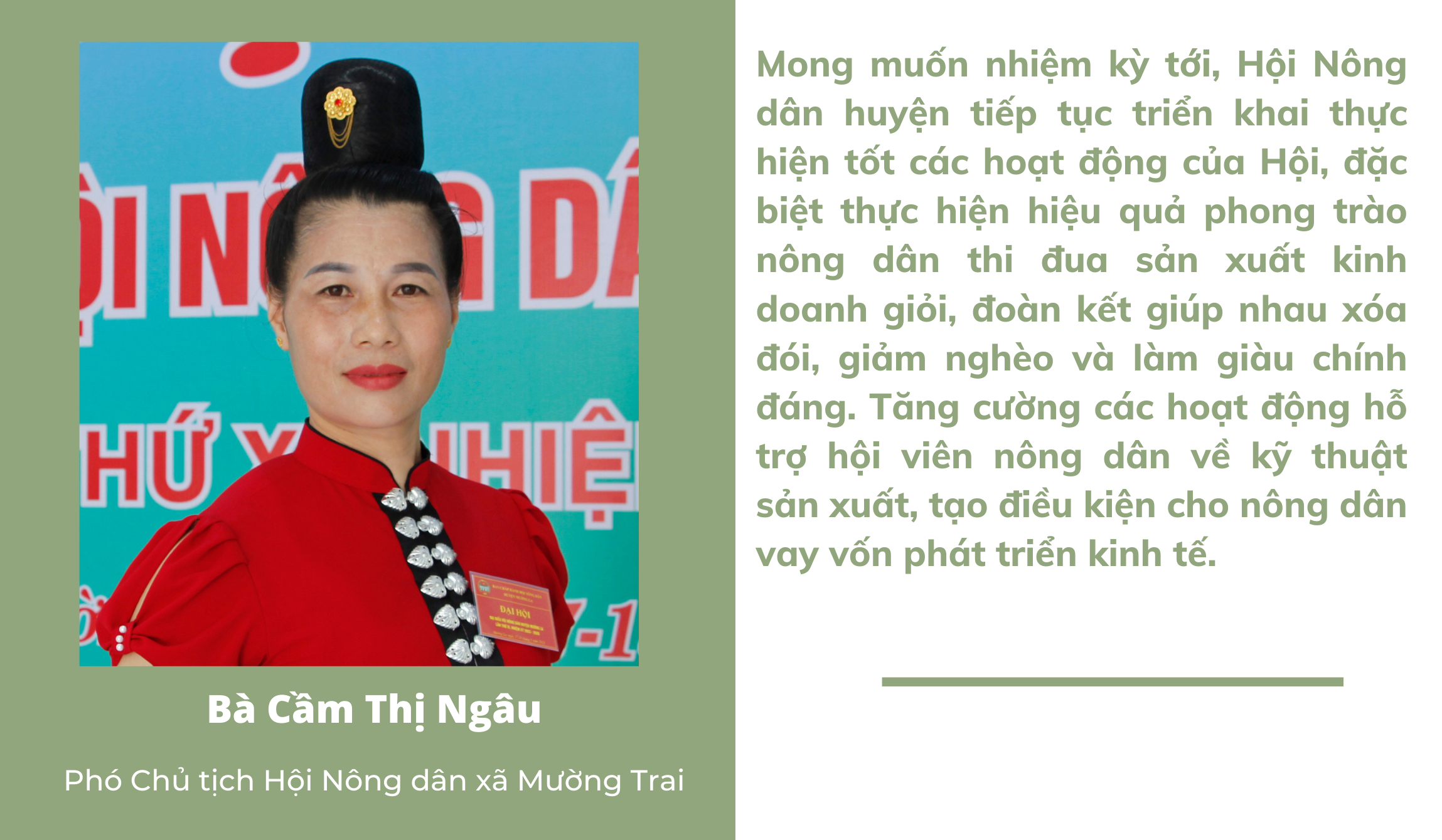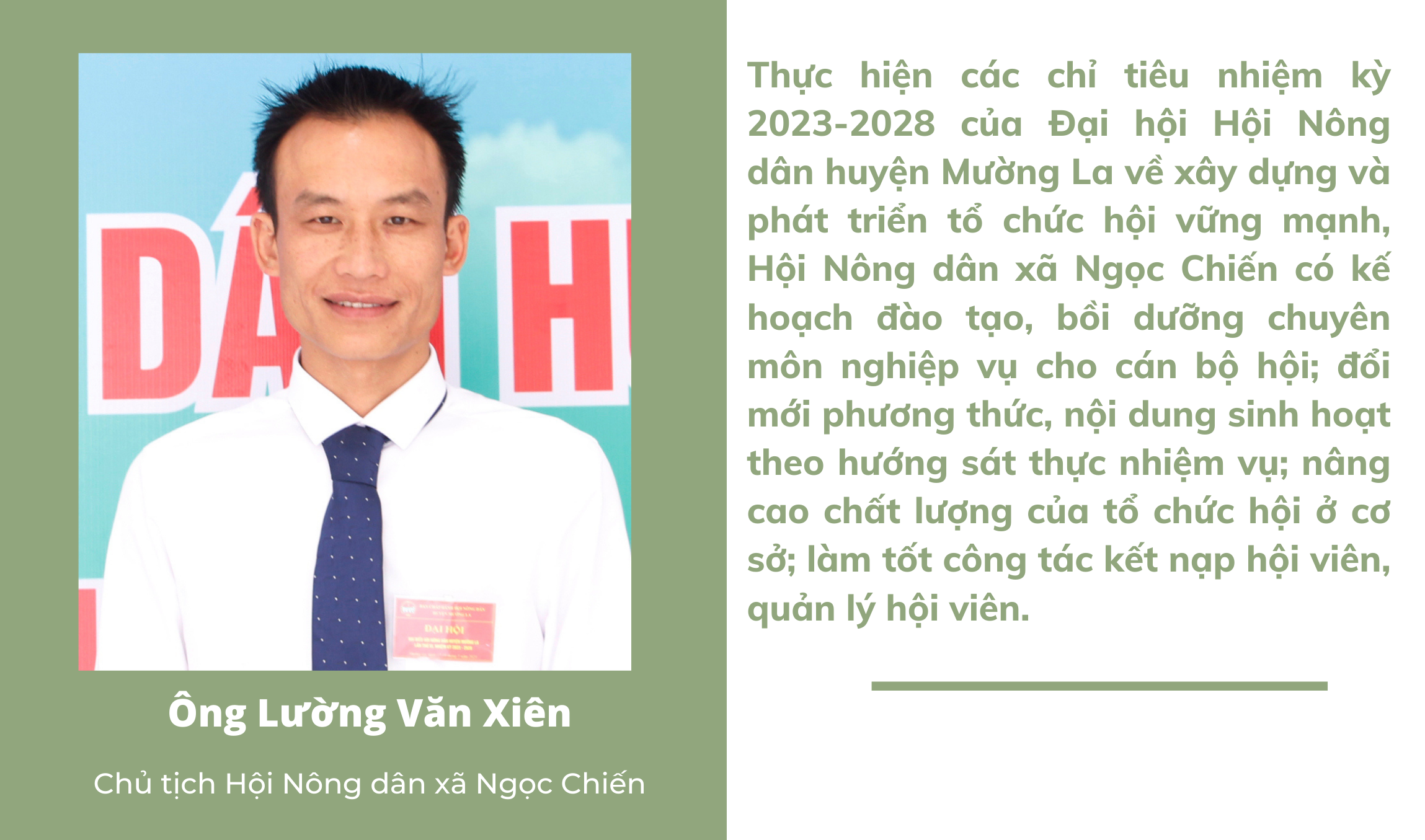 Với chủ đề: “Đoàn kết, trí tuệ, sáng tạo, phát triển, bền vững”, nhiệm kỳ 2023-2028, Hội Nông dân huyện Mường La phấn đấu hằng năm kết nạp mới từ 300 hội viên trở lên; có 60% hộ hội viên nông dân đăng ký và phấn đấu có 50% số hộ đăng ký trở lên đạt danh hiệu hộ “Sản xuất kinh doanh giỏi” các cấp theo tiêu chí của Trung ương Hội Nông dân Việt Nam; 100% hộ nông dân sản xuất kinh doanh giỏi cam kết bảo đảm an toàn vệ sinh thực phẩm; tăng trưởng, phát triển Quỹ hỗ trợ nông dân cấp huyện từ 300 triệu đồng trở lên; phấn đấu xây dựng mô hình bò sinh sản hỗ trợ hội viên nông dân nghèo đạt từ 15 con trở lên; mỗi cơ sở Hội xây dựng ít nhất từ 1- 2 mô hình “Dân vận khéo” có sức lan tỏa trong cộng đồng...