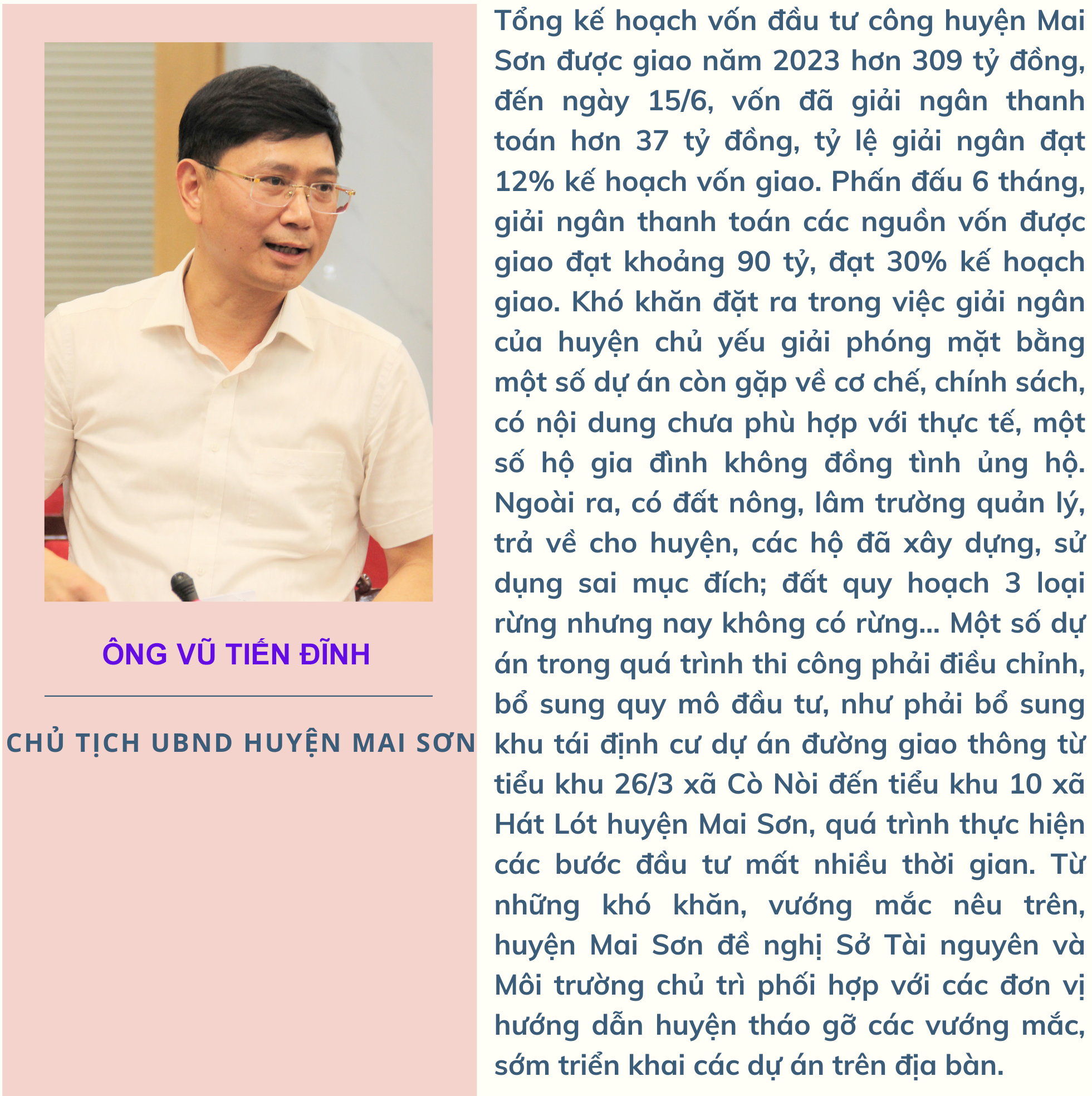 Có nhiều nguyên nhân dẫn đến giải ngân vốn đầu tư công đạt thấp. Cụ thể, các dự án thuộc kế hoạch vốn năm 2022 được phép kéo dài thời gian thực hiện và giải ngân sang năm 2023, có 2 dự án gặp khó khăn trong việc giải phóng mặt bằng: Dự án xây dựng kết cấu hạ tầng khu dân cư Bệnh viện Đa khoa tỉnh Sơn La; dự án kè suối Nặm La (đoạn từ hồ Tuổi Trẻ - cầu Tông Panh). Đối với các dự án chuyển tiếp kế hoạch năm 2023, gặp khó khăn liên quan đến giải phóng mặt bằng, khan hiếm nguyên vật liệu và điều chỉnh dự án.