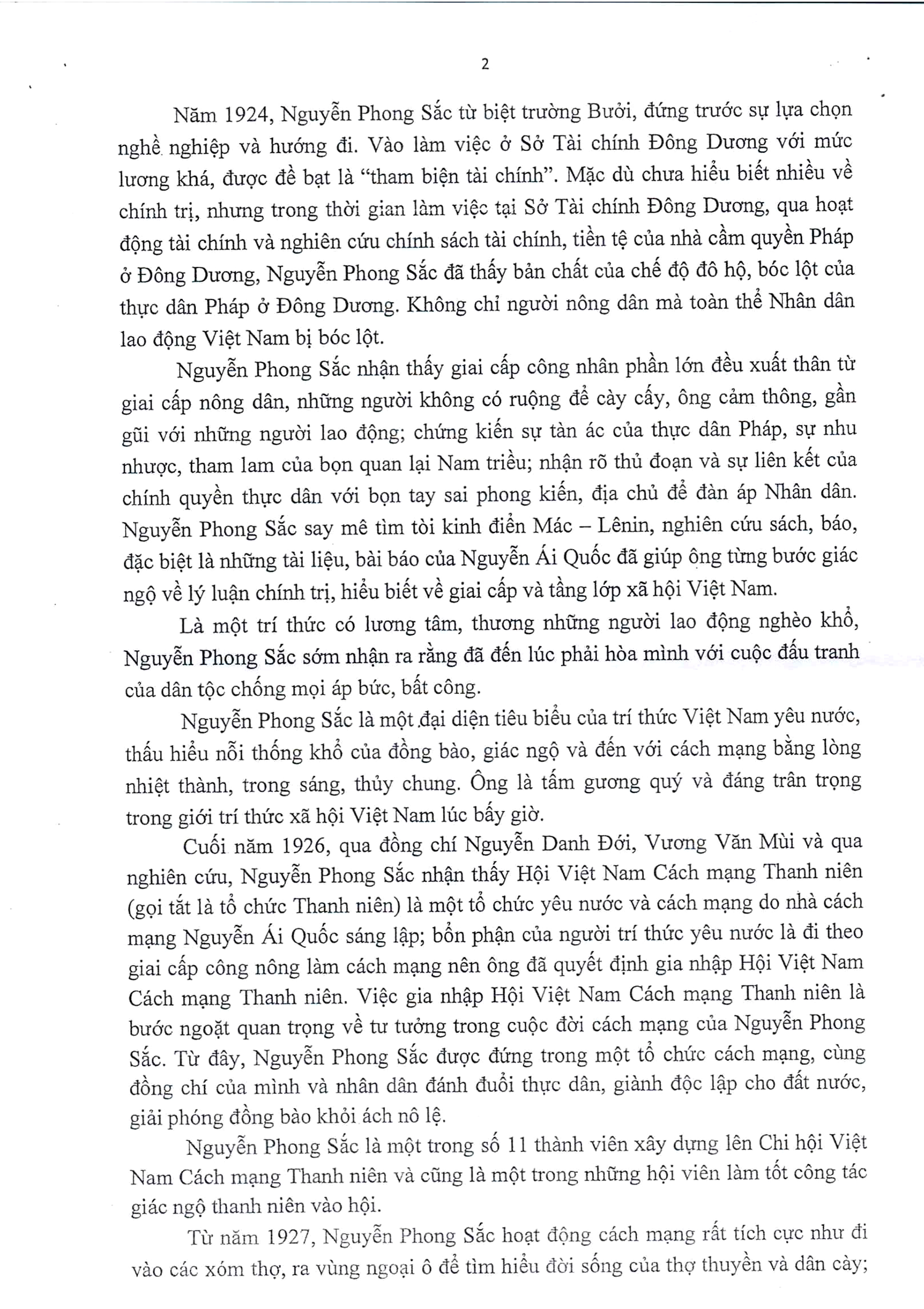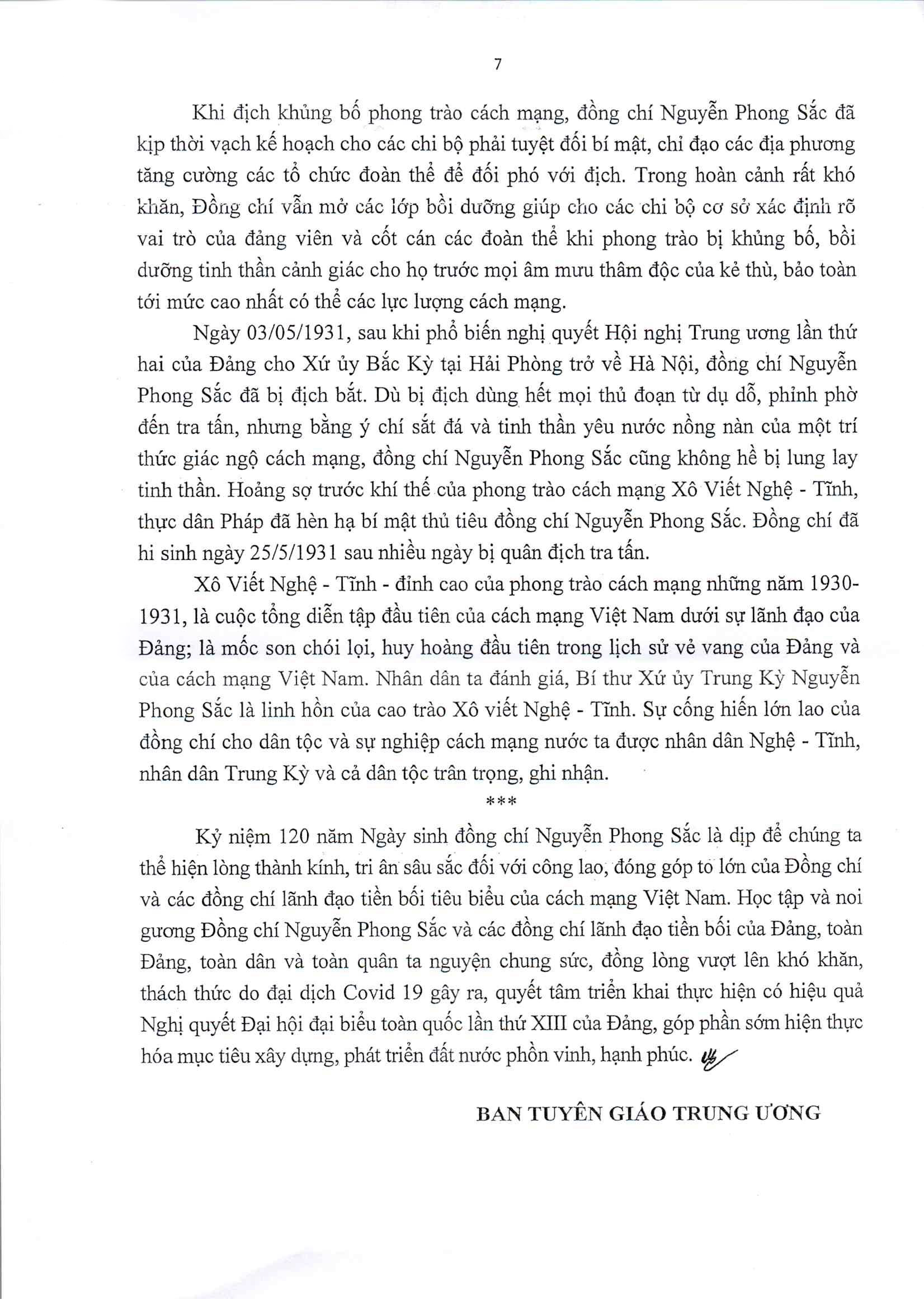 Nhân dịp kỷ niệm 120 năm ngày sinh của đồng chí Nguyễn Phong Sắc (01/02/1902 - 01/02/2022), Ban Tuyên giáo Trung ương đã ban hành hướng dẫn tuyên truyền về cuộc đời, sự nghiệp của đồng chí. Báo Sơn La xin đăng toàn văn Hướng dẫn: