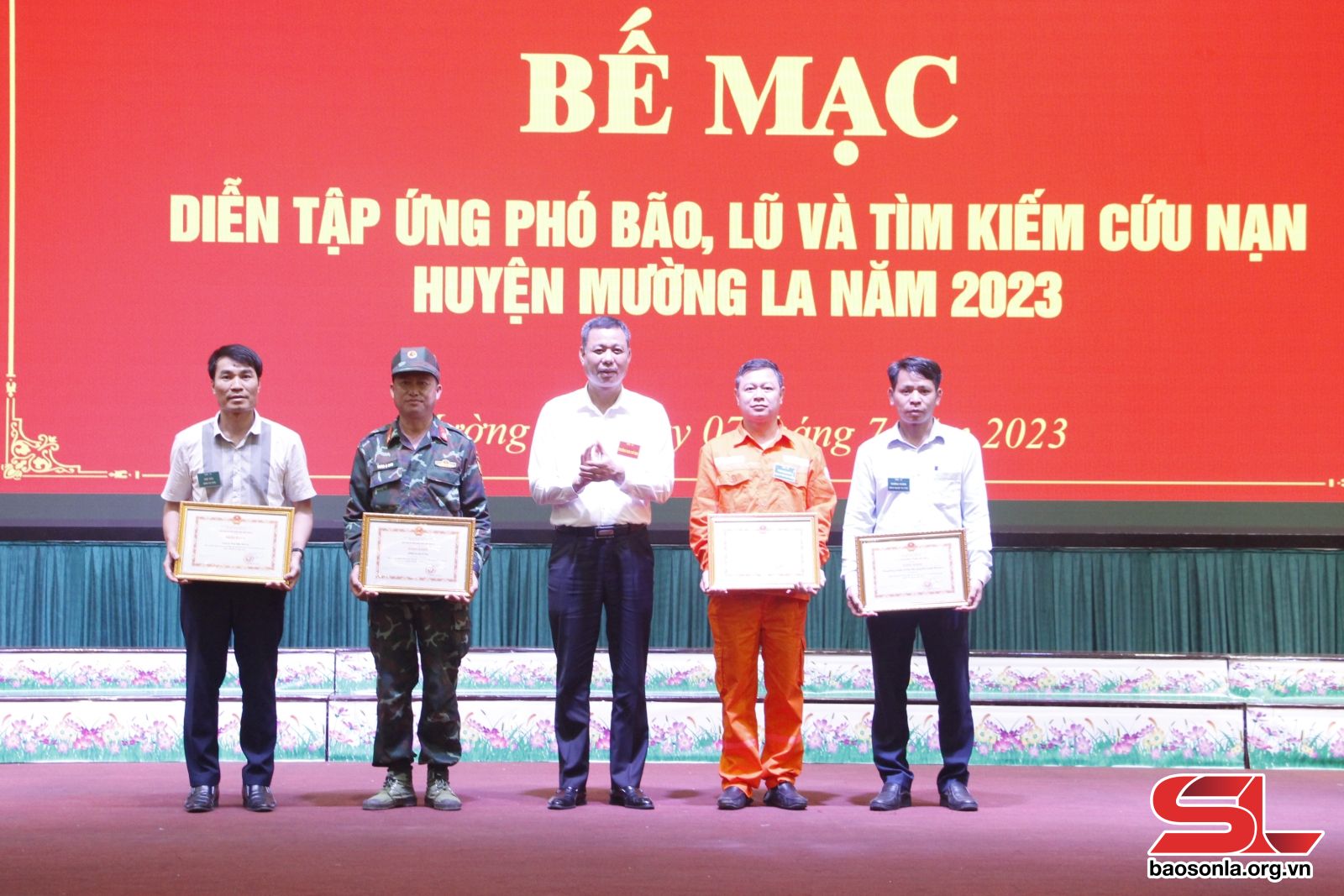 UBND tỉnh đã tặng bằng khen cho 5 tập thể, 10 cá nhân; UBND huyện Mường La tặng giấy khen cho 10 tập thể, 25 cá nhân có thành tích xuất sắc trong diễn tập ứng phó bão, lũ và tìm kiếm cứu nạn huyện Mường La năm 2023.