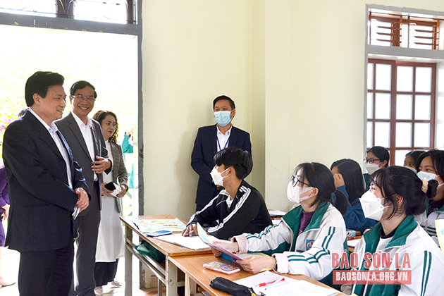 Đồng chí Thứ trưởng Bộ Giáo dục và Đào tạo đến thăm Trường THPT Mộc Lỵ, huyện Mộc Châu.