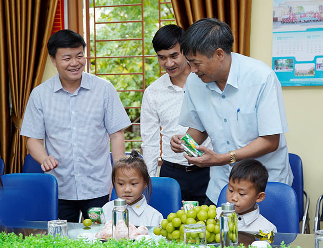 Các đồng chí lãnh đạo tỉnh và huyện Phù Yên trao quà Tết Trung thu cho các em học sinh.