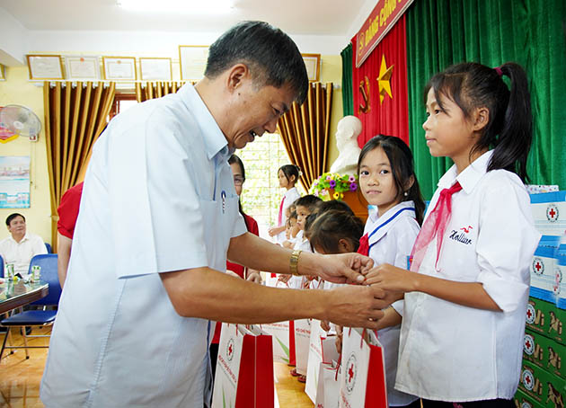 Đồng chí Bí thư Tỉnh uỷ tặng quà cho các em học sinh.