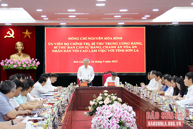 Ngày 26/9, đồng chí Nguyễn Hòa Bình, Ủy viên Bộ Chính trị, Bí thư Trung ương Đảng, Chánh án Tòa án nhân dân tối cao cùng Đoàn công tác đã làm việc với Ban Thường vụ Tỉnh ủy Sơn La.