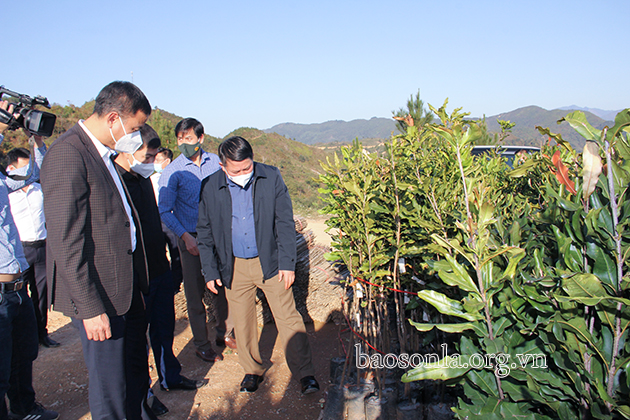 Đồng chí Phó Bí thư Thường trực Tỉnh ủy thăm mô hình trồng mắc ca của HTX Mường Giôn, xã Mường Giôn, huyện Quỳnh Nhai.