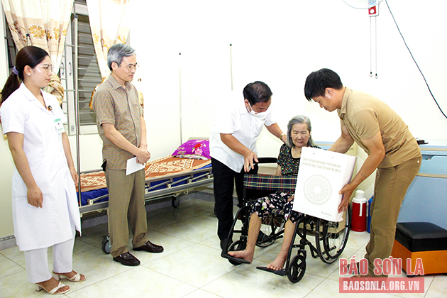 Đồng chí Chá A Của đến thăm, chuyển trao quà cho Mẹ Việt Nam Anh hùng Đinh Thị Lai. Ảnh: Ngọc Trà