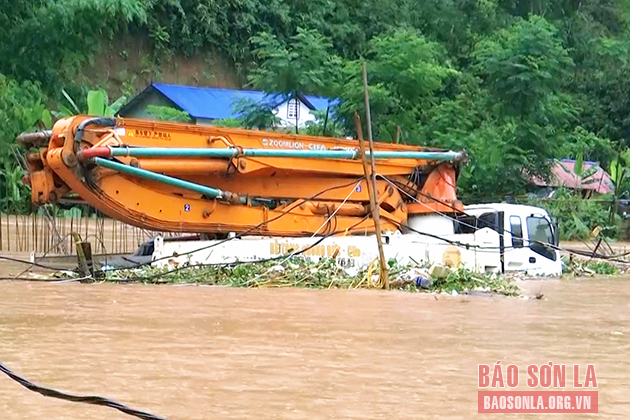Ô tô đổ bê tông kè suối Nặm La bị ngập trong lũ