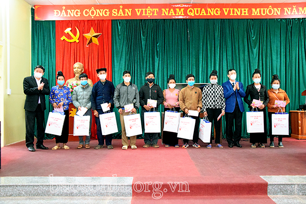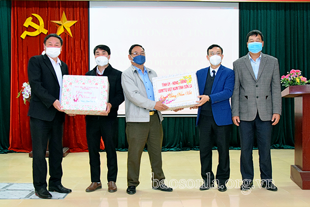 Đồng chí Trưởng Ban Tổ chức Tỉnh ủy, lãnh đạo huyện Mường La tặng quà thị trấn Ít Ong.