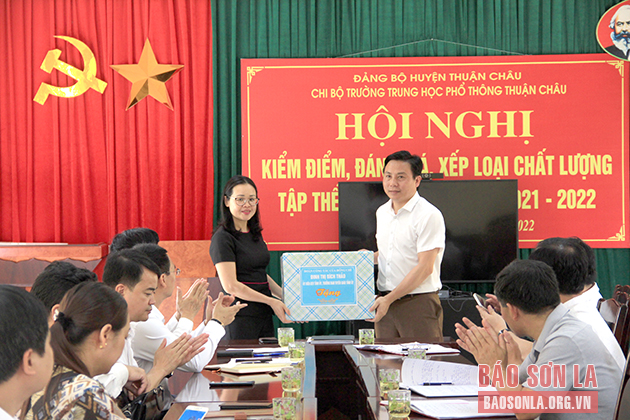 Đồng chí Trưởng ban Tuyên giáo Tỉnh ủy tặng quà cho Trường THPT Thuận Châu.