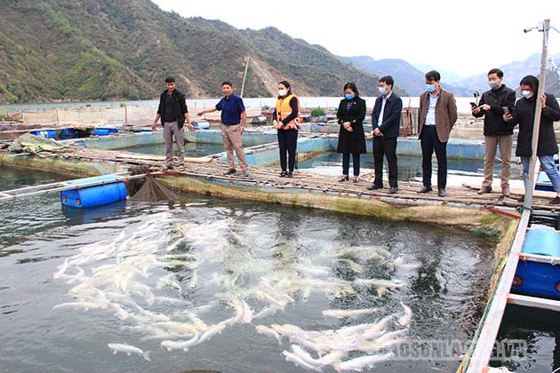 Đoàn công tác thăm mô hình nuôi cá lồng tại bản Ban Xa, xã Liệp Tè.