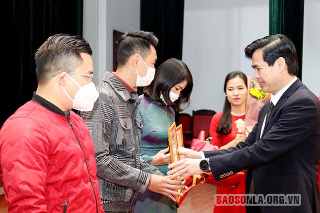 Các tác giả và nhóm tác giả đoạt giải A báo chí về xây dựng Đảng năm 2021 nhận Bằng khen của UBND tỉnh.