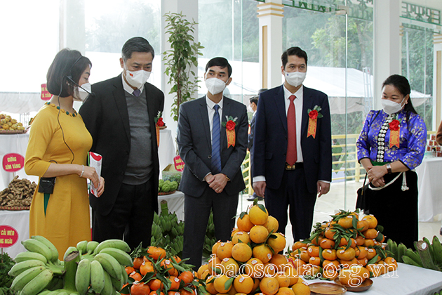 Đồng chí Bí thư Tỉnh ủy tham quan gian hàng trưng bày tại huyện Phù Yên.