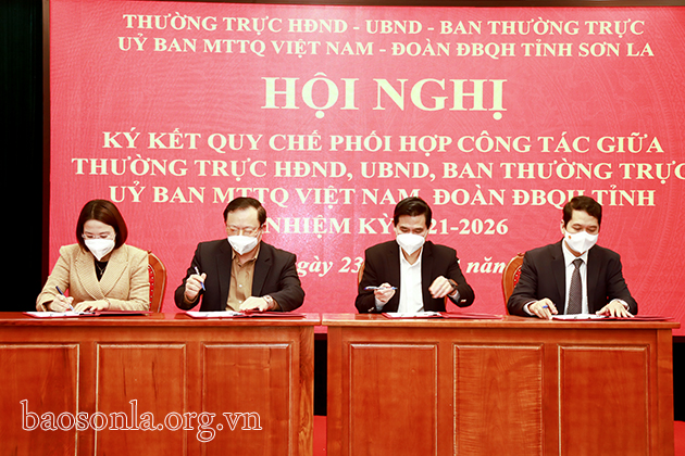 Tại Hội nghị, Thường trực HĐND, UBND, Ban Thường trực Ủy ban MTTQ và Đoàn đại biểu Quốc hội tỉnh đã ký Quy chế phối hợp công tác giai đoạn 2021-2026. Quy chế phối hợp công tác gồm các nội dung: Công tác xây dựng pháp luật của Đoàn ĐBQH tỉnh; chuẩn bị nội dung Đoàn ĐBQH tham dự các kỳ họp Quốc hội; chuẩn bị nội dung và tổ chức Kỳ họp HĐND tỉnh; hoạt động khảo sát, giám sát, phản biện xã hội; hoạt động tiếp xúc cử tri của ĐBQH và các đại biểu HĐND tỉnh; tổng hợp, đôn đốc, giám sát việc giải quyết và trả lời kiến nghị của cử tri; hoạt động tiếp công dân, đôn đốc, giám sát việc giải quyết đơn thư khiếu nại, tố cáo, kiến nghị, phản ánh của công dân; giải quyết những nội dung giữa hai kỳ họp HĐND tỉnh... Việc phối hợp dựa trên nguyên tắc chủ động, thống nhất, tuân thủ đúng trình tự, thủ tục và thời hạn giải quyết công việc theo quy định của pháp luật và quy chế.
