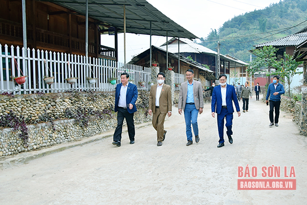 Đồng chí Bùi Tiến Sỹ, Bí thư Đảng ủy xã Ngọc Chiến, huyện Mường La (thứ 3 từ trái qua) giới thiệu các công trình do người dân địa phương góp sức xây dựng.