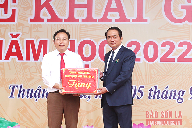 Đồng chí Lê Hồng Minh, Phó Chủ tịch UBND tỉnh trao quà của Tỉnh ủy, HĐND, UBND, Ủy ban MTTQ Việt Nam tỉnh cho Trường THPT Thuận Châu.