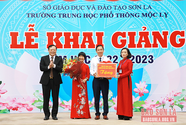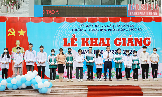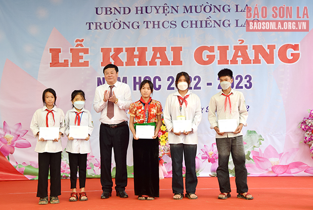 Nhân dịp này, đồng chí Lê Hồng Long đã trao quà của Tỉnh ủy, HĐND, UBND, Ủy ban MTTQ Việt Nam tỉnh cho nhà trường; Ban Tổ chức Tỉnh ủy tặng 5 suất quà, trị giá 1 triệu đồng/suất; Hội Khuyến học tỉnh tặng 5 suất học bổng, trị giá 1 triệu đồng/suất từ Quỹ học bổng Tô Hiệu cho học sinh nghèo vượt khó học giỏi; lãnh đạo Huyện ủy Mường La tặng quà cho nhà trường.