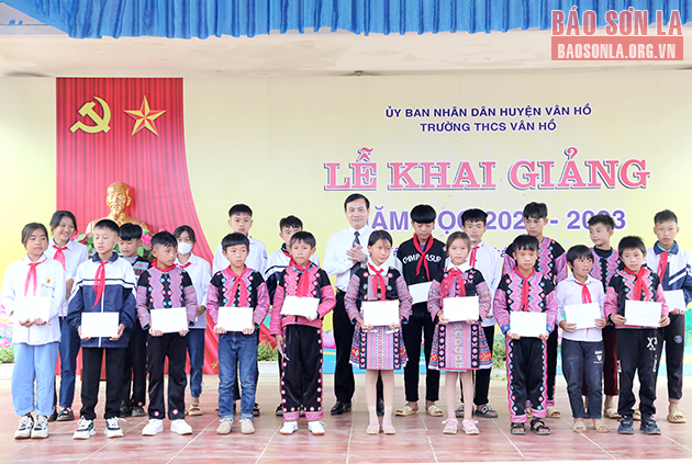 Lãnh đạo huyện Vân Hồ tặng quà cho học sinh có hoàn cảnh khó khăn.