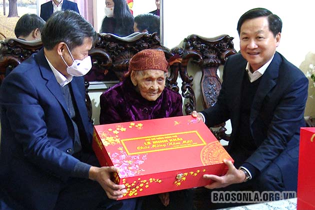 Đồng chí Phó Thủ tướng Chính phủ và đồng chí Bí thư Tỉnh ủy Sơn La tặng quà tết Mẹ Việt Nam Anh hùng Đoàn Thị Diệp.