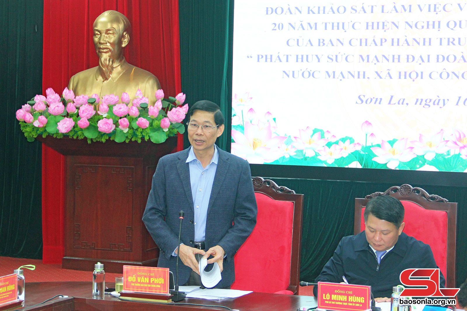 Ngày 16/12, Đoàn khảo sát của Ban Chỉ đạo Trung ương tổng kết 20 năm Nghị quyết số 23-NQ/TW ngày 12/3/2003 của Ban Chấp hành Trung ương Đảng (khóa IX) về phát huy sức mạnh đại đoàn kết toàn dân tộc vì dân giàu, nước mạnh, xã hội công bằng, dân chủ, văn minh, do đồng chí Đỗ Văn Phới, Phó Trưởng Ban Dân vận Trung ương làm Trưởng đoàn đã làm việc với Tỉnh ủy Sơn La.