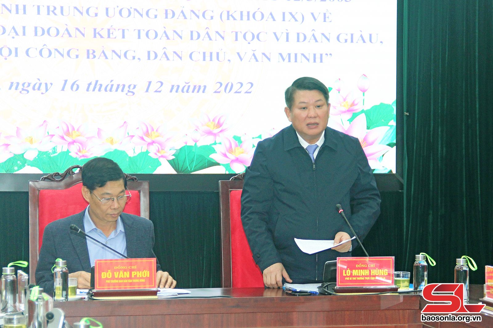 Đồng chí đề nghị tỉnh Sơn La tiếp tục lãnh đạo, chỉ đạo các địa phương thực hiện tốt, có hiệu quả phương châm “ Dân biết, dân bàn, dân làm, dân kiểm tra, dân giám sát, dân thụ hưởng”. Các tổ chức đoàn thể phát huy vai trò nòng cốt để vận động nhân dân, đưa sức mạnh đại đoàn kết dân tộc thành sức mạnh tổng hợp trong phát triển kinh tế-xã hội, quốc phòng an ninh của địa phương. Trong đó, phát huy lợi thế về nguồn lao động; bản sắc văn hoá của 12 dân tộc tại địa phương để tạo ra những giá trị khác biệt, đặc sắc; xác định những vấn đề thách thức mới trong triển khai Nghị quyết số 23-CT/TW, kiến nghị đề xuất phù hợp với thực tế của địa phương; đánh giá, so sánh với giai đoạn trước và mục tiêu phấn đấu cụ thể để triển khai hiệu quả.
