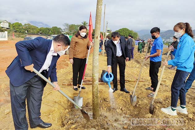 Cán bộ, công chức, viên chức huyện Sông Mã tham gia trồng cây xanh.