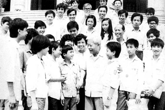 Đồng chí Phạm Hùng trò chuyện với các thầy, cô giáo và học sinh dự thi quốc tế các môn Nga văn, toán và vật lý ngày 17/9/1987.