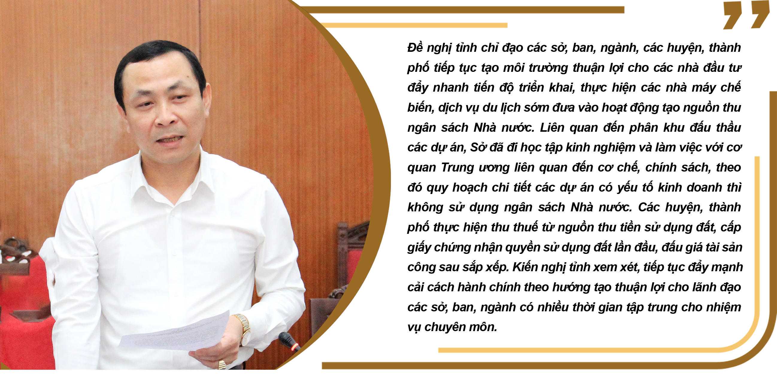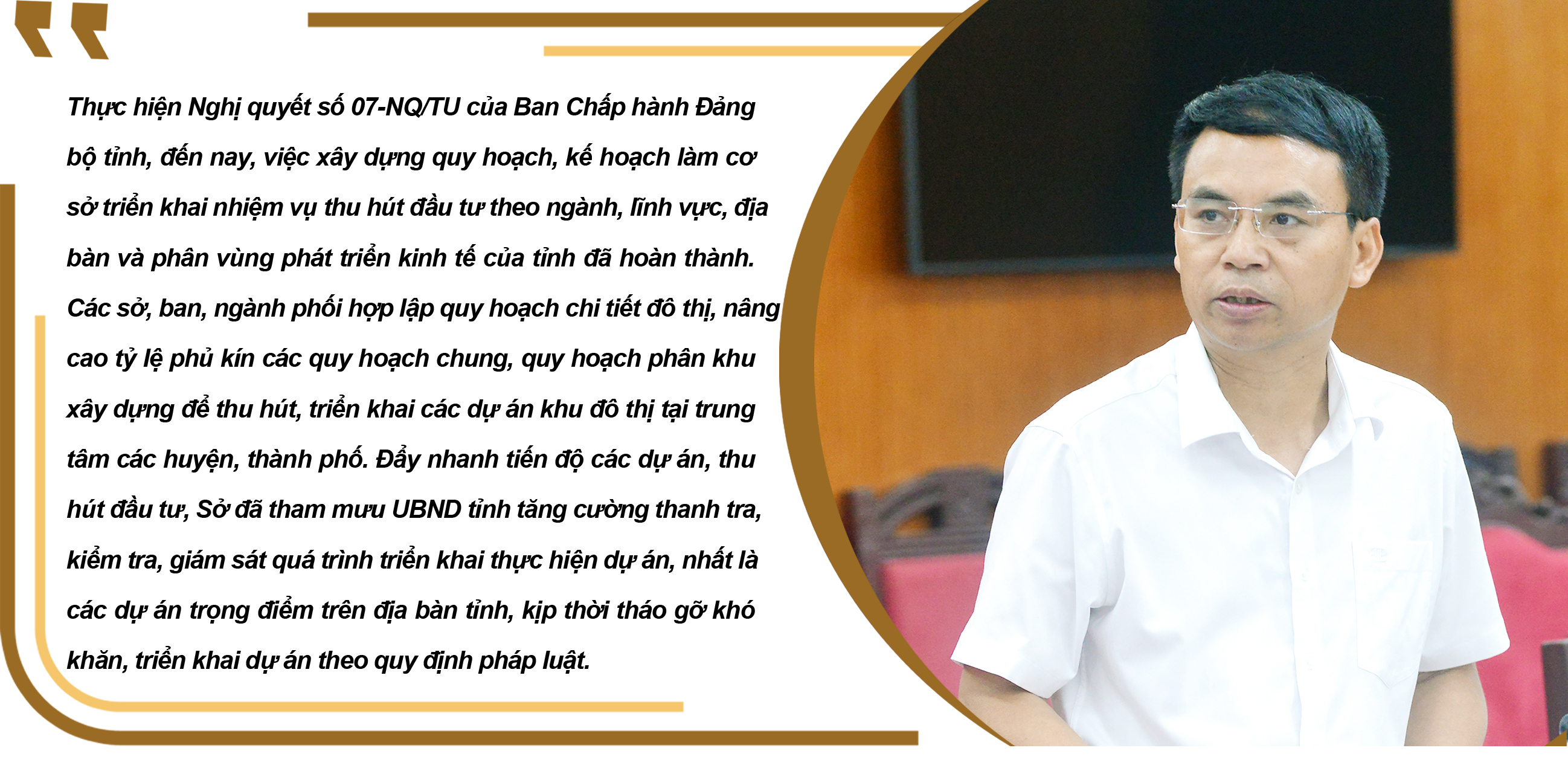 Đối với Nghị quyết số 07-NQ/TU ngày 21/01/2021 của Ban Chấp hành Đảng bộ tỉnh, đồng chí Bí thư Tỉnh ủy đề nghị Ban cán sự UBND tỉnh, các sở, ngành, địa phương tập trung đẩy nhanh tiến độ lập các quy hoạch xây dựng, quy hoạch đô thị, quy hoạch chung cấp xã đảm bảo thống nhất, đồng bộ, làm cơ sở thực hiện thu hút đầu tư, huy động nguồn lực. Tiếp tục thu hút đầu tư, khuyến khích các doanh nghiệp tham gia đầu tư, hoạt động kinh doanh dịch vụ logistics phát triển các trung tâm thương mại tại các đô thị lớn của tỉnh. Nghiên cứu trình HĐND tỉnh ban hành nghị quyết quy định hỗ trợ vùng nông nghiệp ứng dụng công nghệ cao trên địa bàn tỉnh giai đoạn 2023-2025, nhằm thu hút, thúc đẩy phát triển nông nghiệp ứng dụng công nghệ cao, nông nghiệp hữu cơ, nông nghiệp thông minh, nông nghiệp số, nông nghiệp sinh thái, phát triển các loại cây trồng, vật nuôi, thủy sản có giá trị kinh tế cao...