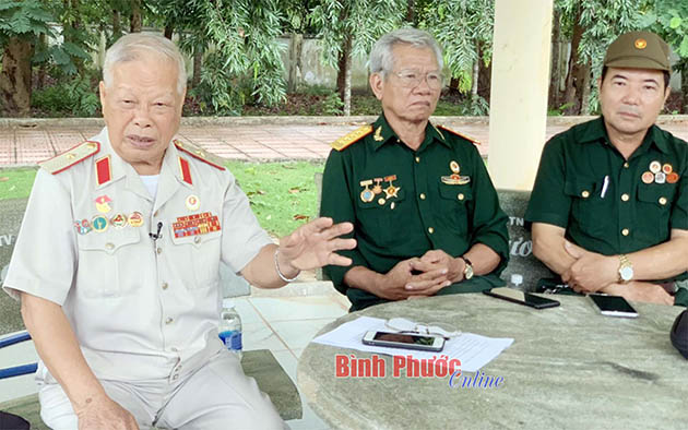 Thiếu tướng Nguyễn Ngọc Doanh, nguyên Chính ủy Trung đoàn 141, Sư đoàn 7, nguyên Phó tư lệnh Chính trị Quân đoàn 4 cùng đồng đội và các cựu chiến binh huyện Hớn Quản, tỉnh Bình Phước ôn lại kỷ niệm những ngày tham gia chiến đấu tại Chốt chặn Tàu Ô
