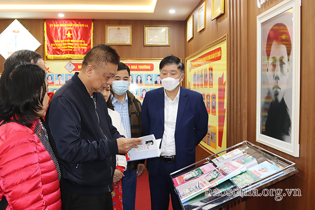 Ông Tô Quyết Tiến và gia đình thăm phòng truyền thống tại Trường THPT Tô Hiệu, thành phố Sơn La.