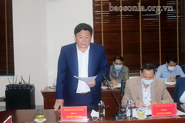 Bí thư Huyện ủy Mường La phát biểu tại cuộc làm việc.