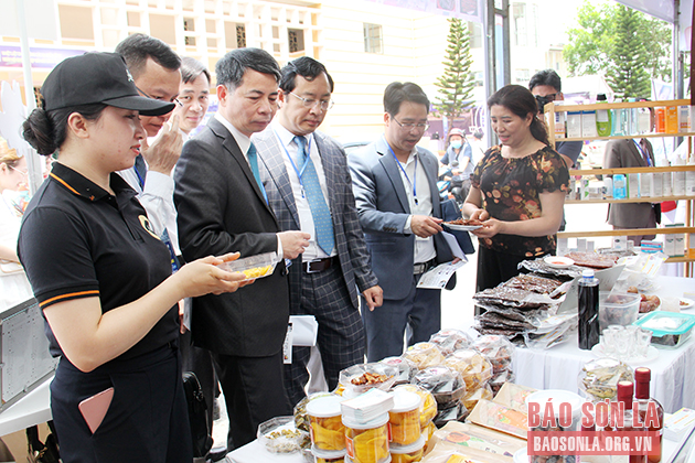 Đại biểu thăm quan 25 gian hàng trưng bày các sản phẩm tiêu biểu của tỉnh Sơn La.