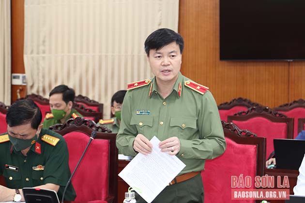 Thiếu tướng Nguyễn Ngọc Vân, Ủy viên Ban Thường vụ Tỉnh ủy, Giám đốc Công an tỉnh phát biểu tại cuộc họp.