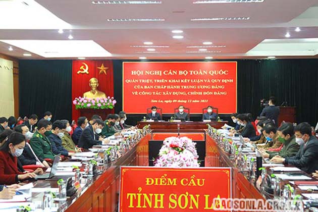 Các đại biểu dự Hội nghị cán bộ toàn quốc, quán triệt triển khai kết luận và quy định của Trung ương về công tác xây dựng, chỉnh đốn Đảng tại điểm cầu tỉnh Sơn La.