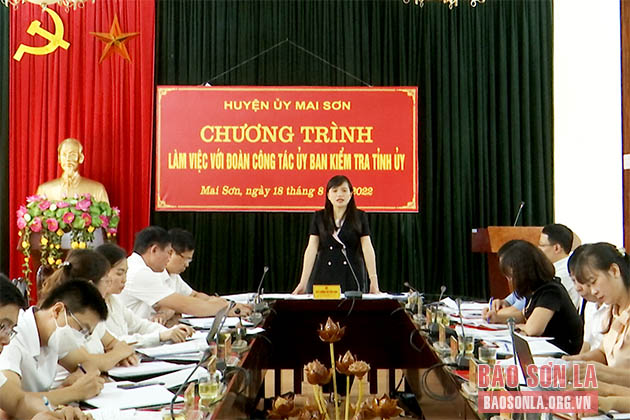 Ngày 18/8, Đoàn công tác Ủy ban Kiểm tra Tỉnh ủy, do đồng chí Lường Thị Vân Anh, Ủy viên Ban Thường vụ Tỉnh ủy, Chủ nhiệm Ủy ban Kiểm tra Tỉnh ủy đã có cuộc làm việc với Thường trực Huyện ủy, Ủy ban Kiểm tra Huyện ủy Mai Sơn, về tình hình thực hiện nhiệm vụ kiểm tra, giám sát, kỷ luật của Đảng và công tác phòng, chống tham nhũng, tiêu cực trên địa bàn huyện từ đầu nhiệm kỳ đến nay.