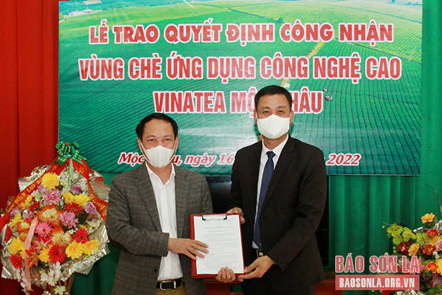Đồng chí Phó Chủ tịch UBND tỉnh trao Quyết định công nhận Vùng chè ứng dụng công nghệ cao Vinatea Mộc Châu.