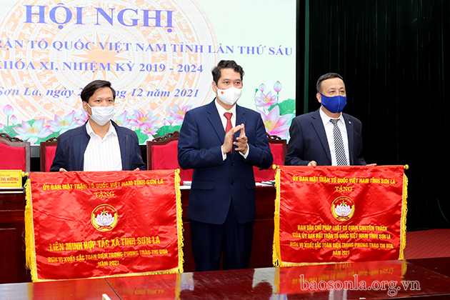 Lãnh đạo Ủy ban MTTQ Việt Nam tỉnh trao Cờ “Đơn vị xuất sắc toàn diện phong trào thi đua năm 2021” cho các tập thể.
