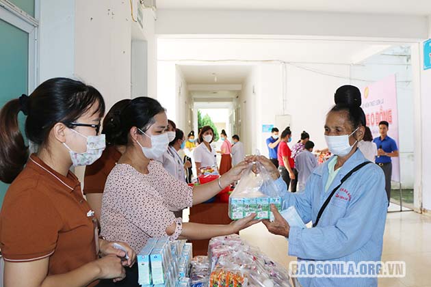 Bệnh nhân và người nhà bệnh nhân đang điều trị nội trú tại Bệnh viện đến nhận hàng đều được phát phiếu để nhận một số sản phẩm như sữa, bánh kẹo, đồ dùng cá nhân, gạo, trứng, dầu ăn... Tổng kinh phí của gian hàng trị giá khoảng 45 triệu đồng.