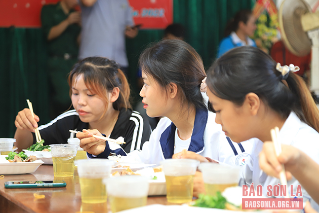 Vui vẻ, cùng nhau quây quần bên mâm cơm, cùng ăn uống, trò chuyện để xua tan đi những lo lắng, căng thẳng, chuẩn bị tâm lý thật tốt cho môn thi kế tiếp, em Lò Thị Hạnh, lớp 12C, Trường THPT Chiềng Khương, nói: Nhà em ở rất xa, nếu thi xong về nhà sẽ không đảm bảo thời gian. Cảm ơn các anh chị đã tiếp sức cho em, có thêm động lực làm bài, vượt qua kỳ thi quan trọng này.