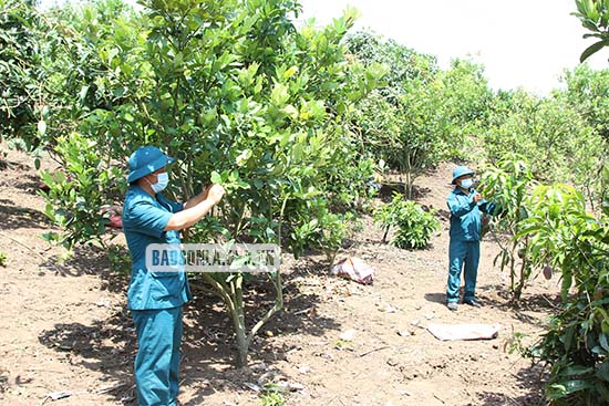 Các chiến sỹ dân quân bản Đông Sằn, xã Nà Bó (Mai Sơn) chăm sóc cây ăn quả giúp người dân xóm Mỏ Đồng.