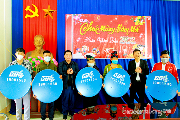Lãnh đạo Báo Sơn La và huyện Sông Mã tặng đầu thu kỹ thuật số cho hộ nghèo xã Bó Sinh.