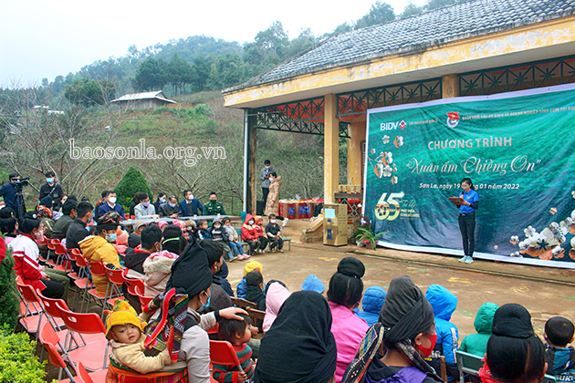 Thăm xã Chiềng On, Chi đoàn BIDV Chi nhánh Sơn La đã phối hợp với Đoàn Khối các cơ quan và doanh nghiệp tỉnh cụm thi đua số 3 và Công ty TNHH thuốc nam Nguyễn Kiều, chi nhánh Sơn La tổ chức Chương trình “Xuân ấm Chiềng On” tại bản Khuông, xã Chiềng On, huyện Yên Châu. Đoàn đã thăm, tặng 25 suất quà cho hộ nghèo bản Khuông; tặng máy lọc nước, 10 suất quà cho học sinh mầm non và tổ chức gian hàng Tết 0 đồng tại điểm Trường Mầm non Hoa Ban, tổng giá trị quà tặng trên 30 triệu đồng.