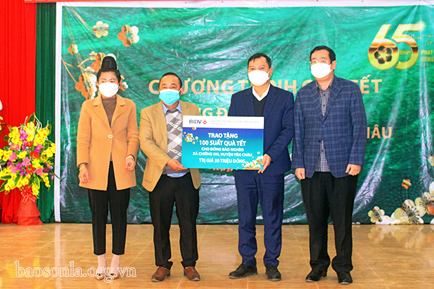 Lãnh đạo BIDV Chi nhánh Sơn La trao tượng trưng 100 suất quà tết cho đại diện lãnh đạo xã Chiềng On, huyện Yên Châu.