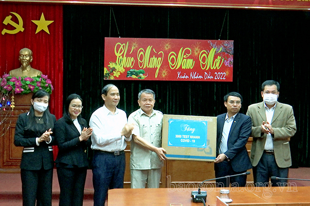 Nhân dịp này, Đoàn công tác trao tặng 3.000 bộ kit test nhanh Covid-19 cho huyện Thuận Châu.