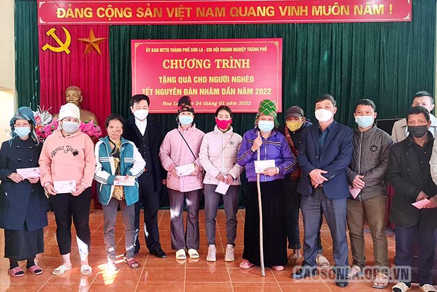 Ngày 24/1, Chi hội Doanh nghiệp thành phố Sơn La đã tổ chức 6 đoàn đến các xã, phường tặng quà tết cho các hộ nghèo, cận nghèo trên địa bàn Thành phố. 382 suất quà, tổng trị giá trên 267 triệu đồng được trao cho 143 hộ nghèo, 239 hộ cận nghèo. Trong đó, mỗi phần quà tết dành cho hộ nghèo trị giá 1 triệu đồng/hộ; hộ cận nghèo 500 nghìn đồng/hộ.